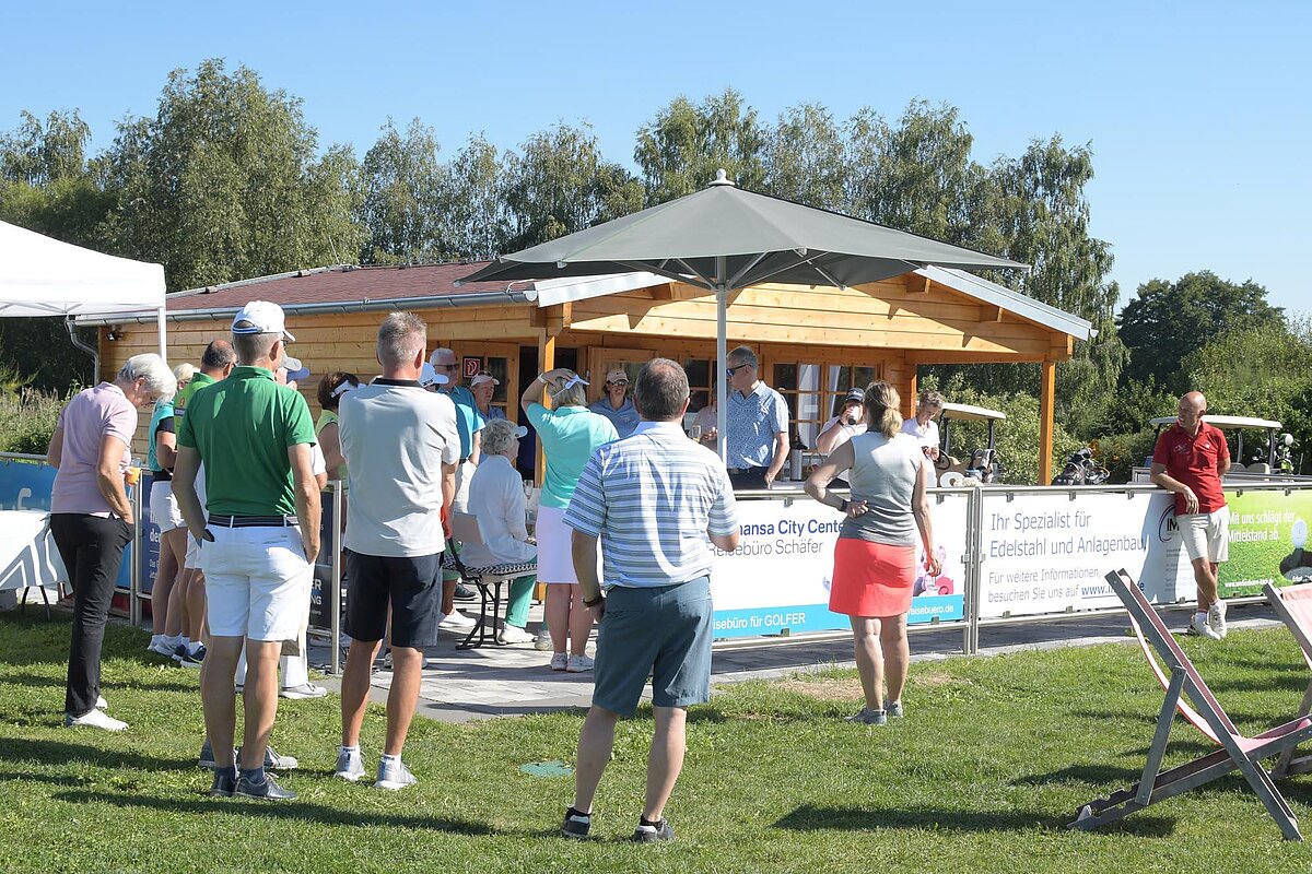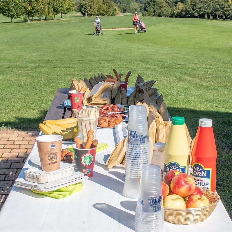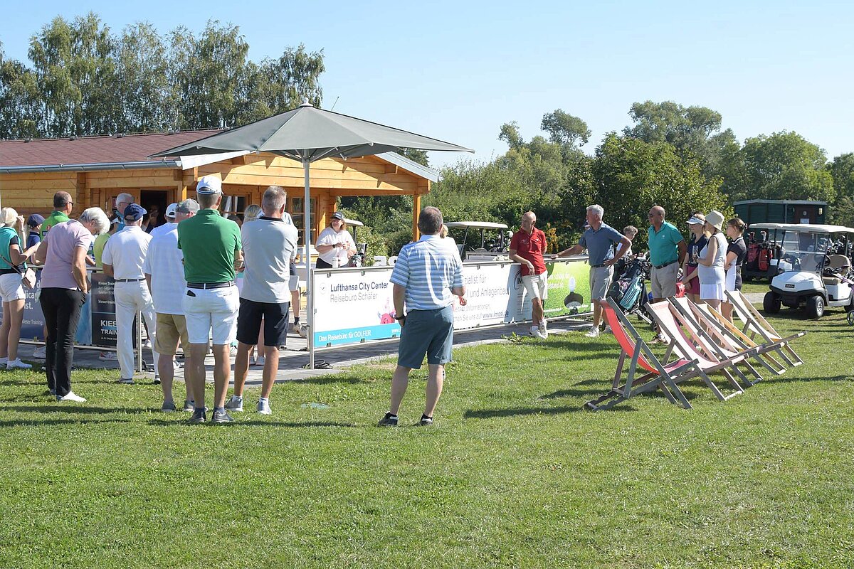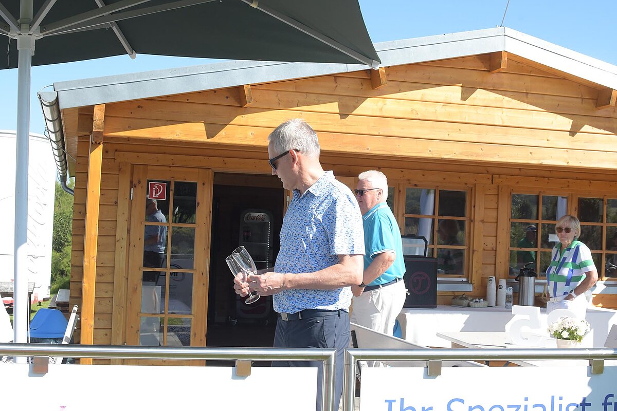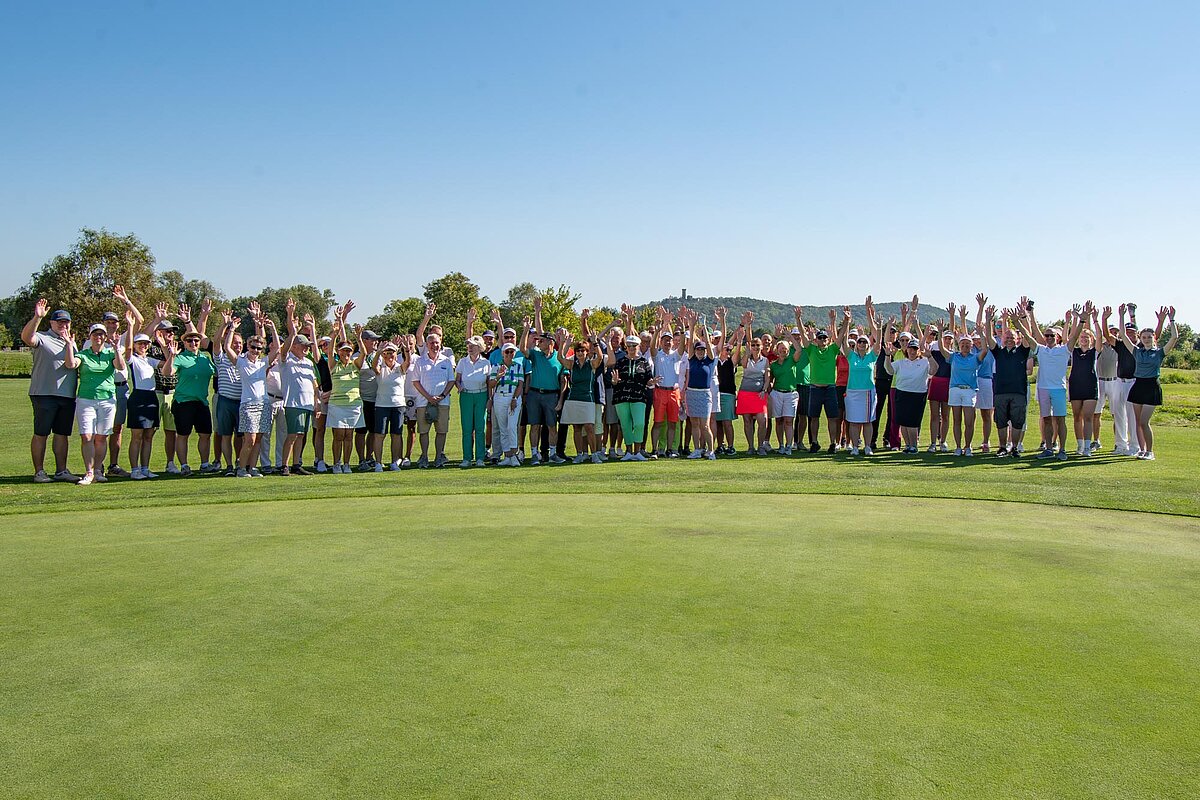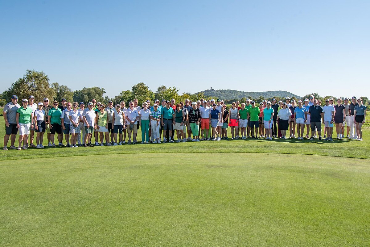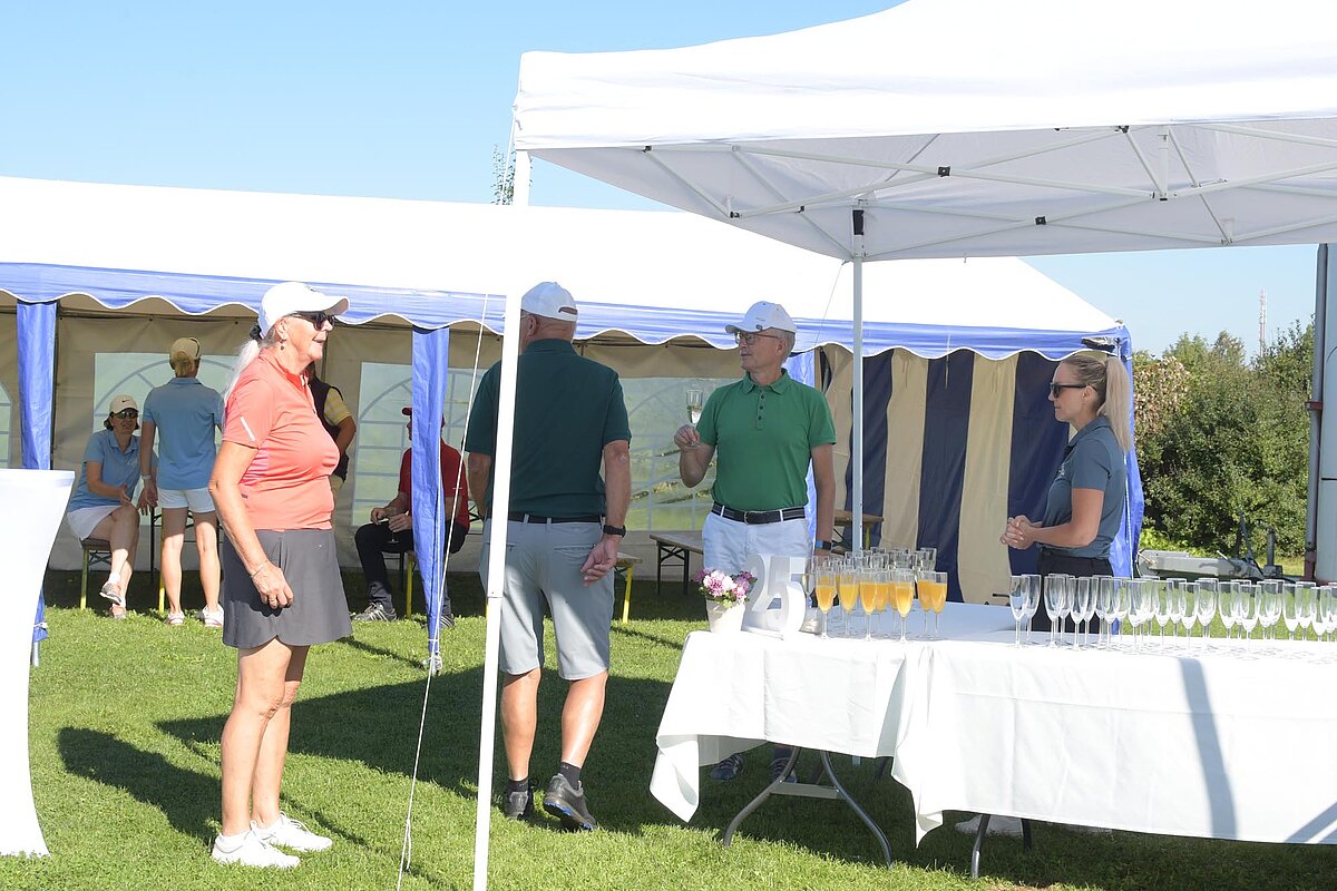 16. September 2023 - High Noon - Startschuss zu unserem Geburtstagsturnier. Bereits ab 10:00 Uhr waren die ersten Spieler auf der Driving Range und haben sich vorbereitet für dieses Turnier! Denn vor dem Kanonenstart musste ja noch etwas erledigt werden. Sektempfang und Begrüßung durch den Präsidenten, Teegeschenk richtig verstauen und gut aussehen beim Gruppenfoto (siehe oben). Alle Löcher waren belegt und 65 Spieler konnten einen phantastischen Tag genießen. An der Hütte an der Bahn 1 gab es Kaffee und Kuchen. Und oben an der Bahn 12 wartete die würzigen Alternativen mit Sandwiches und leckeren Fleischwaren von unserer neuen Fleischerei in Mühlberg. Fazit: Würzig schlägt Süß.